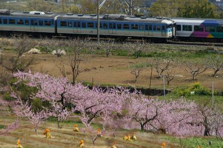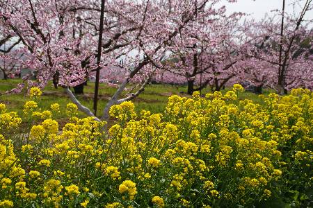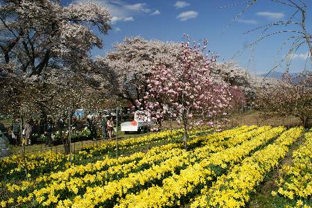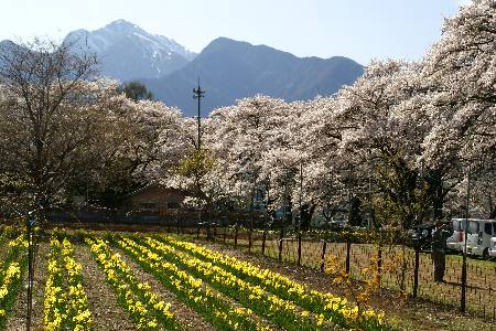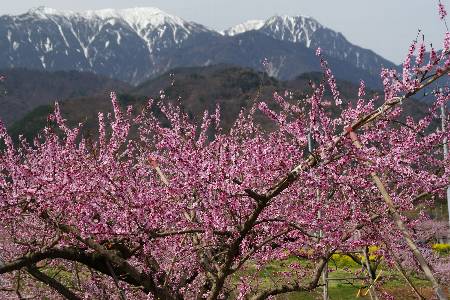 4/9 北杜市方面へ 途中の韮崎市穴山の桃畑へ立寄り 峡東方面より遅い満開だ 甲斐駒もよく見える