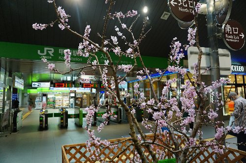 JR甲府駅のコンコースには桃の花が飾ってあった