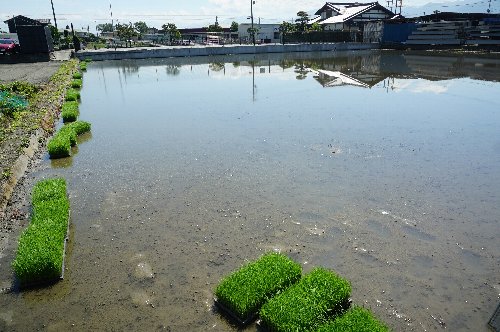 5/9 芽出しを終えて、プールに並べる。2週間余り先に、田植の苗になる予定