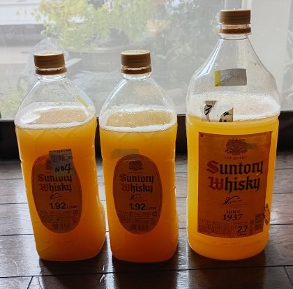果汁のみペットボトルにとり、砂糖を加え、さらに保管する