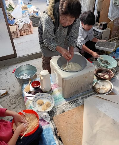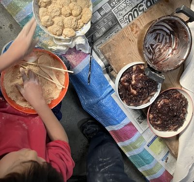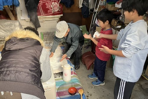 寒さの中、餅つきをした